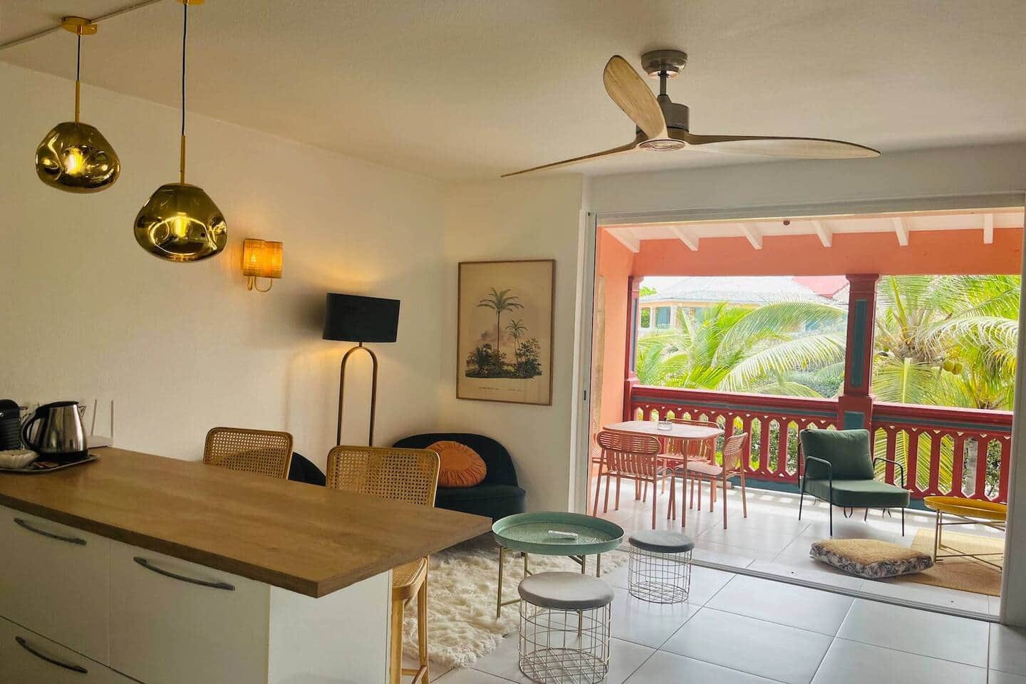 The Kamaoli apartment is perfectly located, offering easy access to all restaurants, beach bars, and amenities. Situated on the first and top floor of a small, very quiet building, it is a duplex. On the main floor, there is a bedroom with a king-size bed, a bathroom with a toilet, and a main living area with an open-plan, fully equipped kitchen and a small lounge opening onto a small terrace.