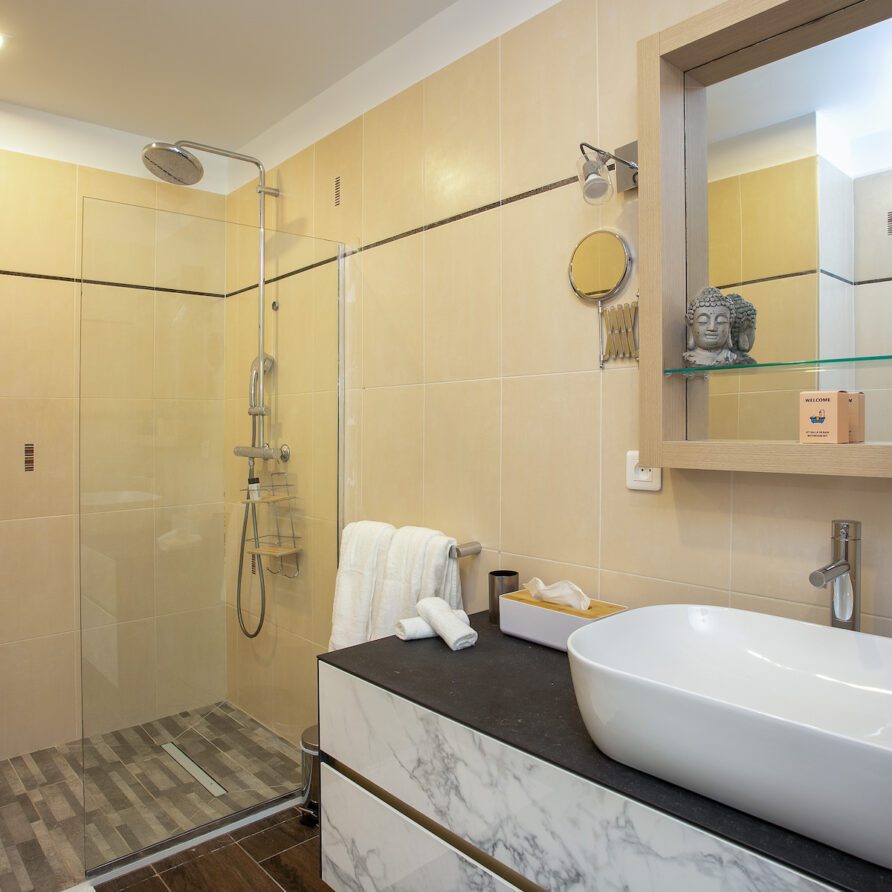 The single-storey Villa is made up of 3 bedroom suites, each with their own private bathroom and dressing room, safe and Nespresso for hotel-style comfort. The decoration of each room is neat and personalized, the beds are “queen” size (160cm).