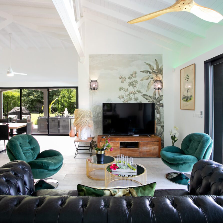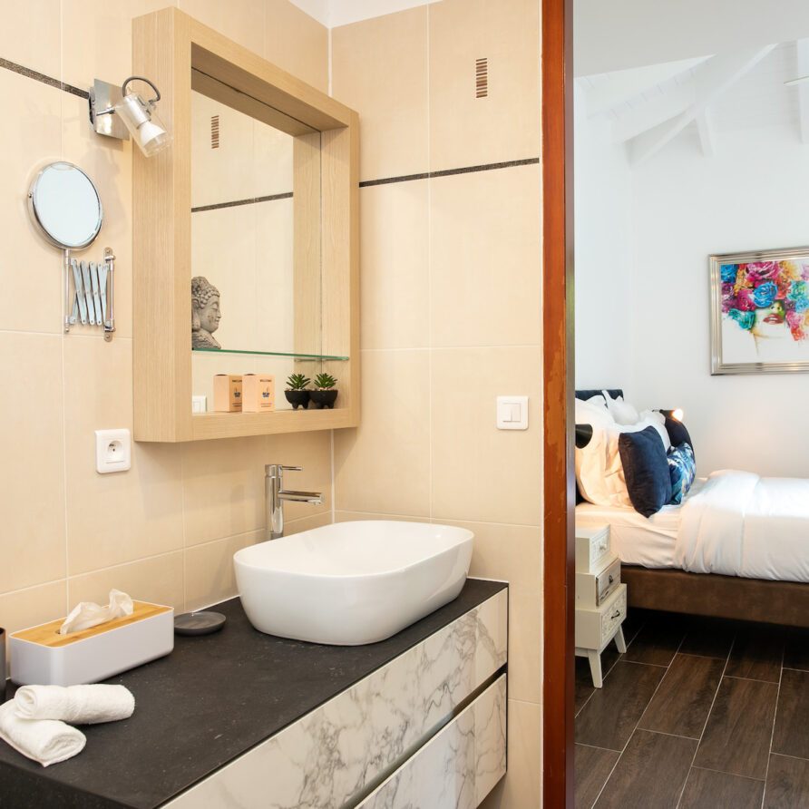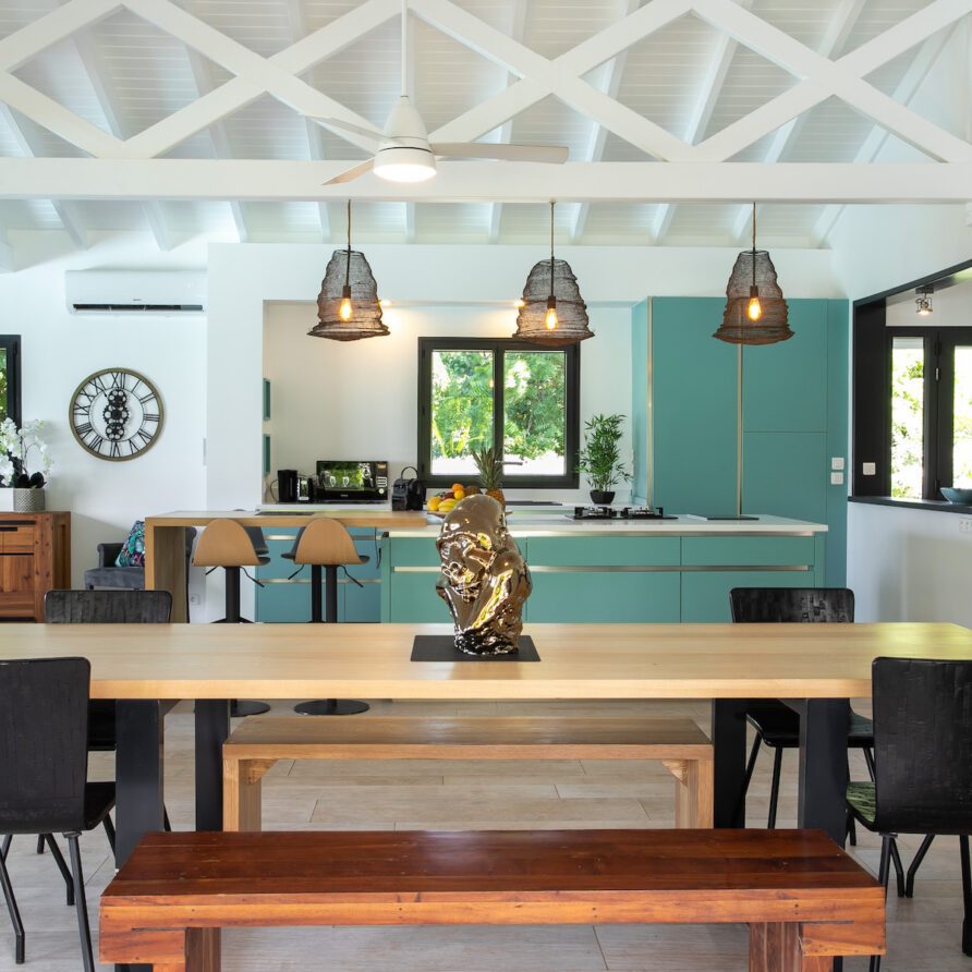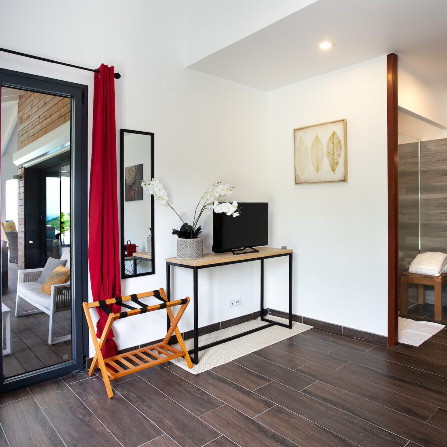 The living room is both modern and exotic in style and bathed in light thanks to large slidding doors which provide panoramic views of the swimming pool, the sea, the mountain or the garden. It is composed of a perfectly equipped kitchen (dishwasher, complete small appliances, oven, induction and gas hobs, etc.), a large convivial table for indoor meals and a cozy and comfortable living room in front of the connected tv. The villa is fully air-conditioned and equipped with fiber optic wifi.