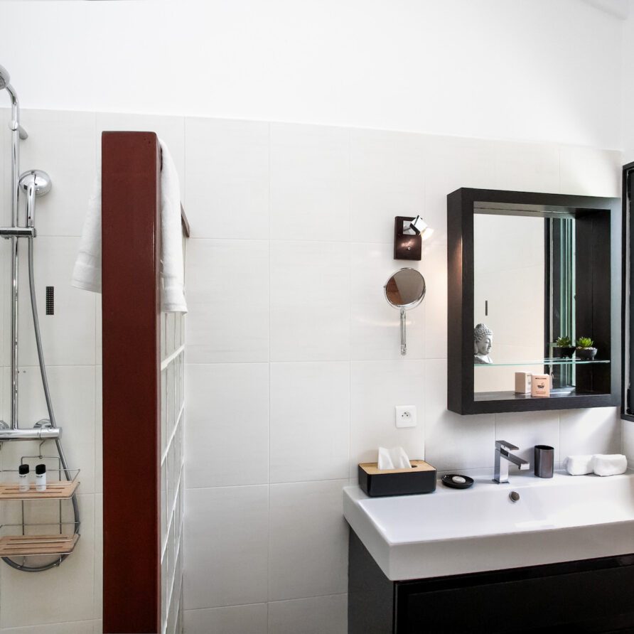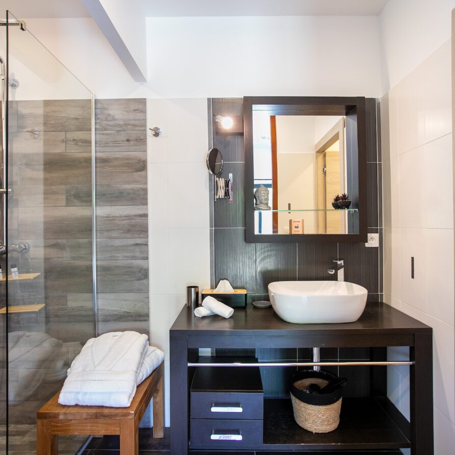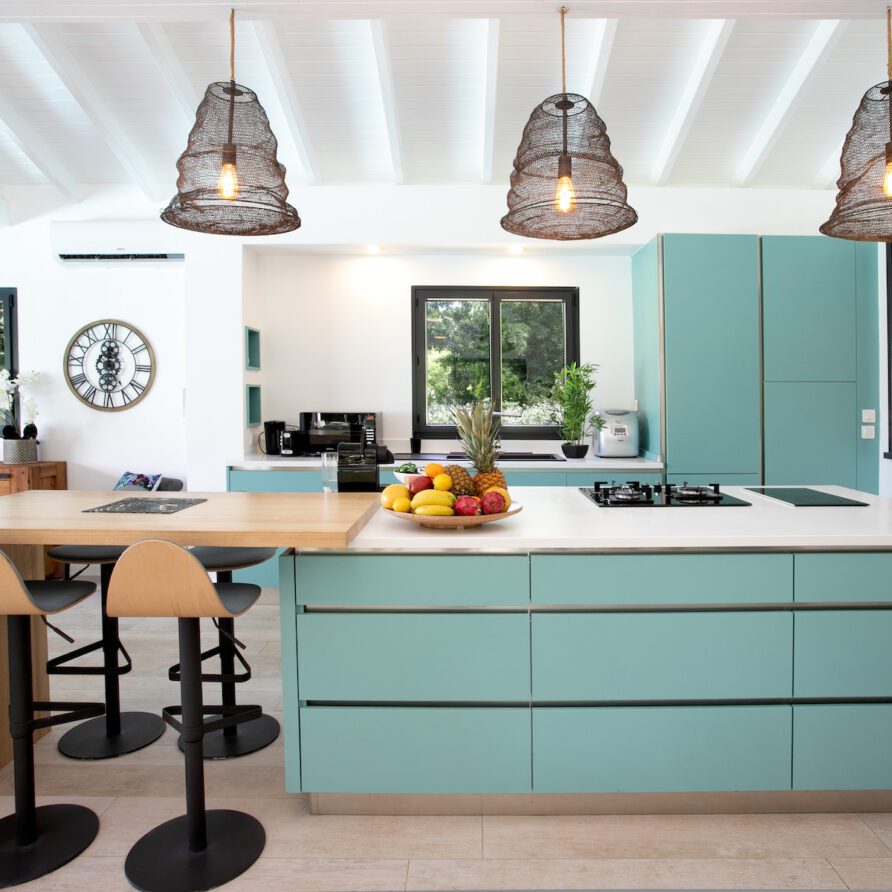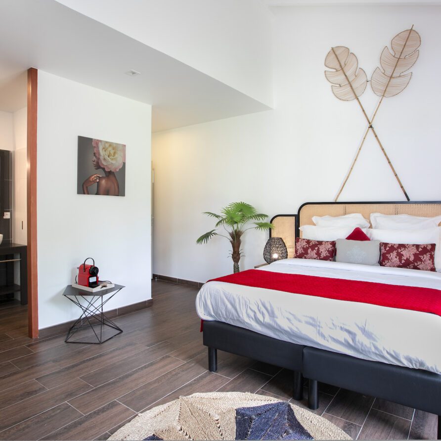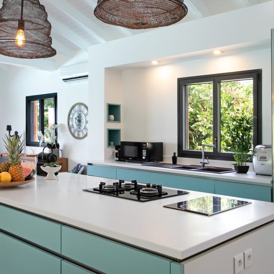 The living room is both modern and exotic in style and bathed in light thanks to large slidding doors which provide panoramic views of the swimming pool, the sea, the mountain or the garden. It is composed of a perfectly equipped kitchen (dishwasher, complete small appliances, oven, induction and gas hobs, etc.), a large convivial table for indoor meals and a cozy and comfortable living room in front of the connected tv. The villa is fully air-conditioned and equipped with fiber optic wifi.