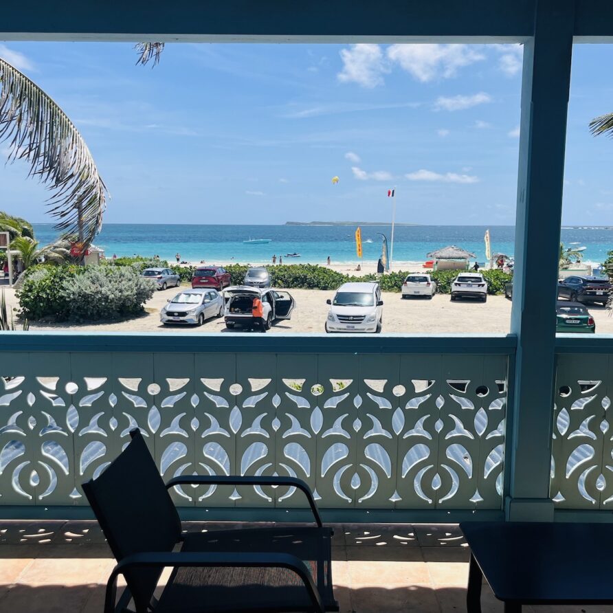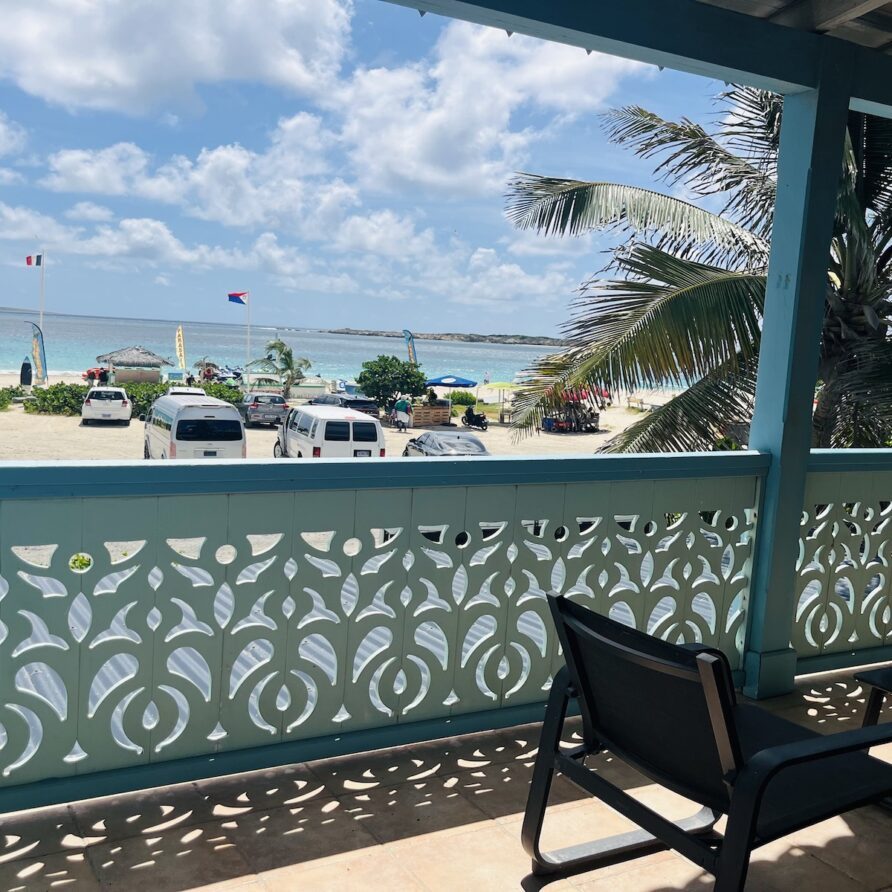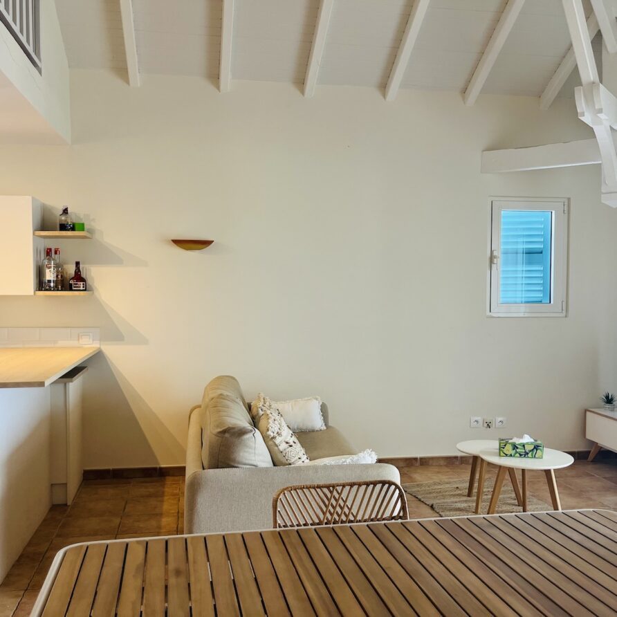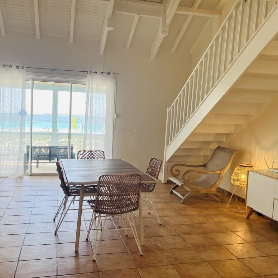 L’appartement Fanny se situe sur la Place du Village de la Baie Orientale avec vue directe sur le water sport du Bikini !!