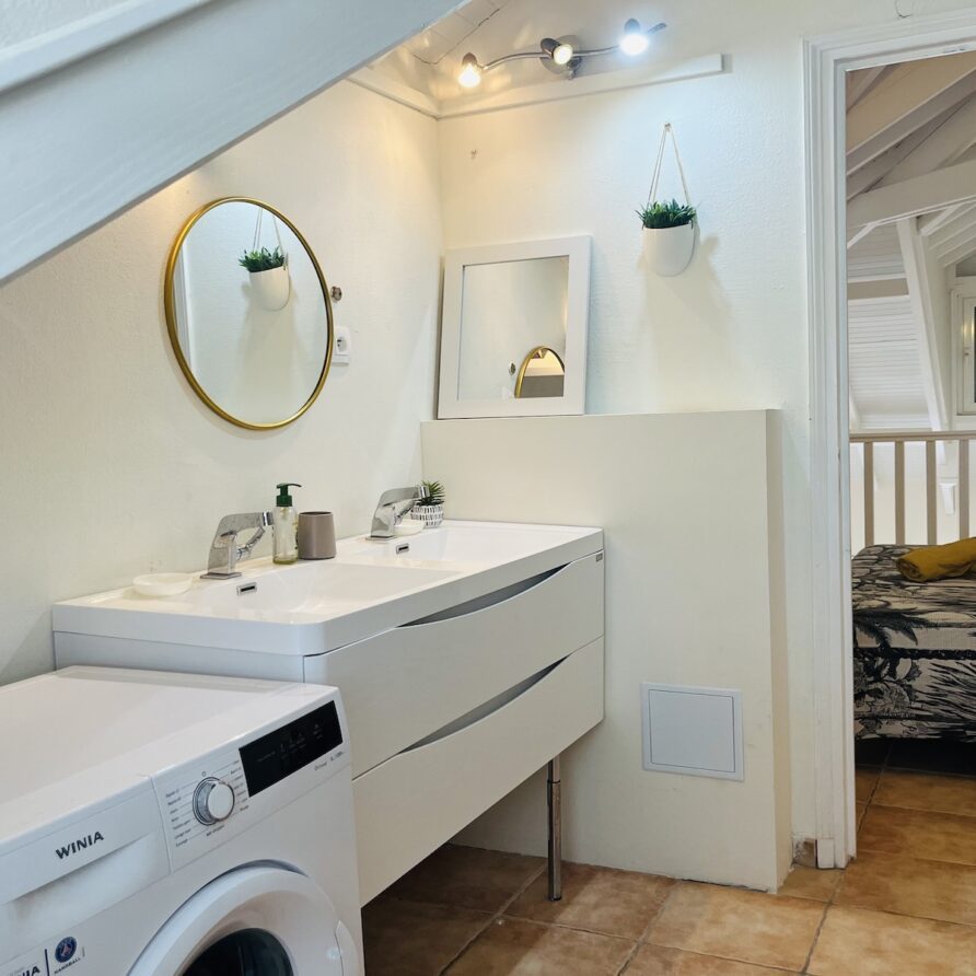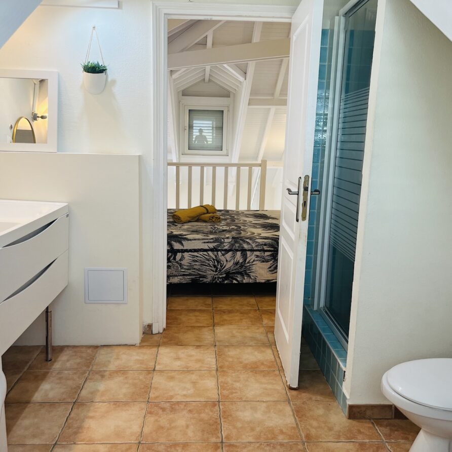 A l’étage une chambre ( lit 160)en mezzanine ouverte sur le salon et sa salle de bain privative.