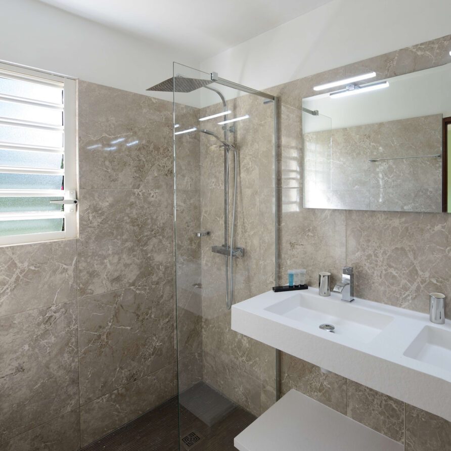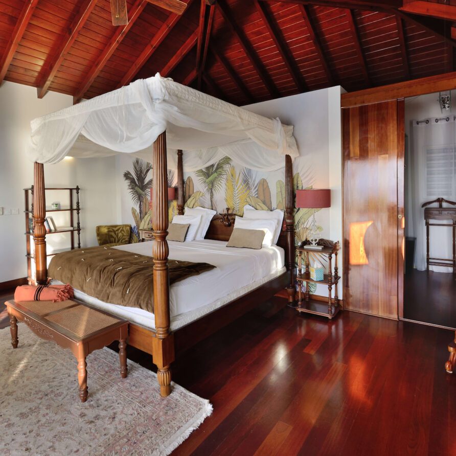 Décoration raffinée, sol en parquet de bois exotique, murs patinés à l’ancienne, touche de couleur par du « stucco à la vénitienne » dans des tons fashion. Des meubles anciens de style caribbéen meublent cette maison dont les matériaux ont été soigneusement choisis entre les bois d’Amérique du Sud et les marbres d’Italie.